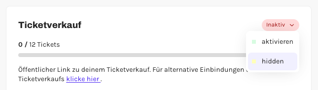 ⚠️ Wichtig: Im Hidden-Modus sind deine Tickets weiterhin in Shop und Widget sichtbar. In-App- und Web-Ticketing sind im Hidden-Modus deaktiviert.
