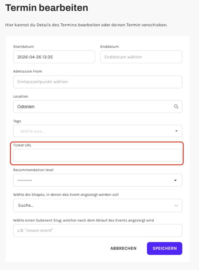 Hier kannst du das Datum, die Location, die Tags und auch den Ticketlink des Termins anpassen: