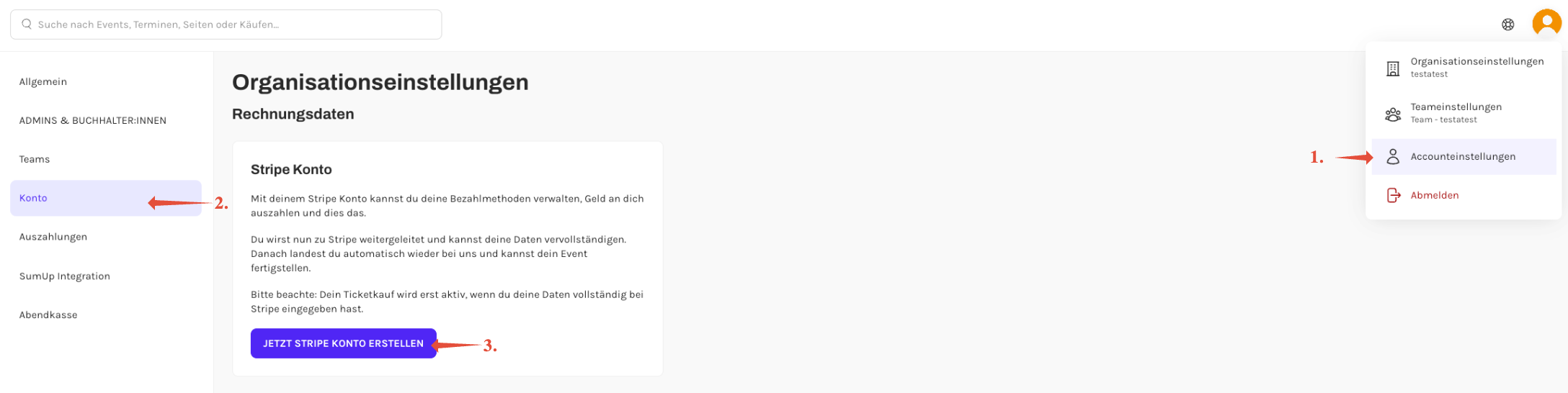 Klicke dafür auf "Accounteinstellungen"(1.), dann "Konto"(2.) und dann auf "Jetzt Stripe Konto erstellen"(3.)