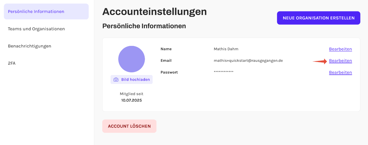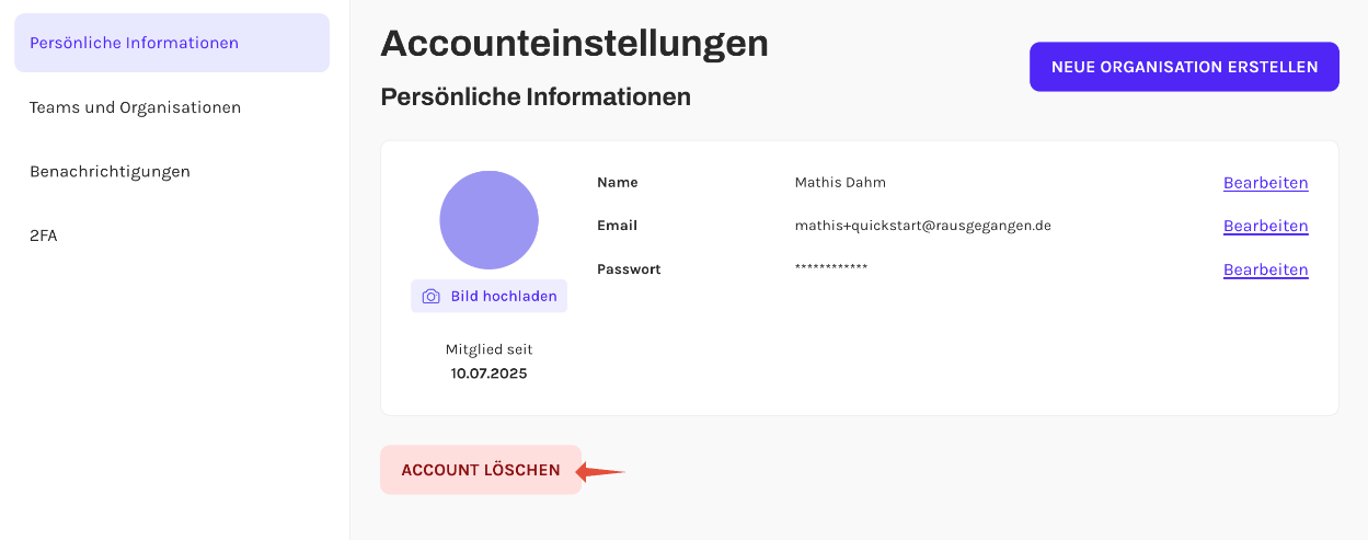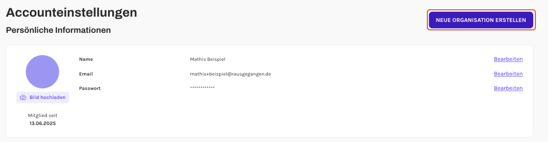 Lege deine neue Organisation an, indem du in die Accounteinstellungen gehst und oben rechts auf "Neue Organisation erstellen" klickst.